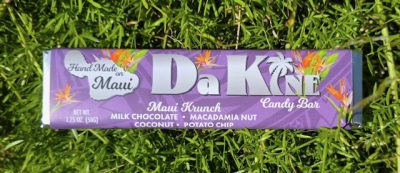 Made on Maui Specialty candy bar of milk chocolate, macadamia nut, coconut, potato chip.
